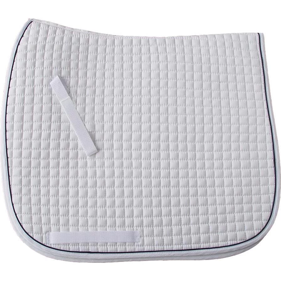 This classic dressage saddle pad is designed with contoured withers and special square quilt pattern to keep foam from shifting. The pad provides great protection without feeling bulky. Lasts through many washes. Horizontal edge-to-edge: 26.5″, depth 23.5″ Made with 100% cotton shell and foam padding. Machine washable.