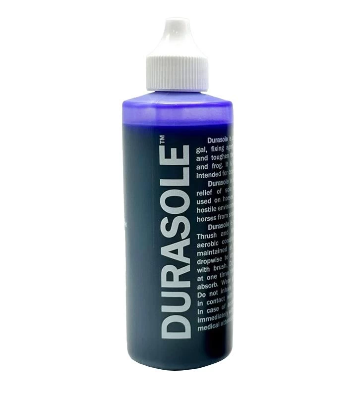 Durasole creates a tough, living pad between your horse’s sensitive sole and the world’s hostile environment. Durasole is an antibacterial, antifungal fixing agent formulated to thicken and toughen the exfoliating sole and frog. Durasole is effective in the control of thrush and white line disease when aerobic conditions are established and maintained at the infection site. Can be used for extended periods of time on chronically thin-soled horses without fear of drying out the foot.