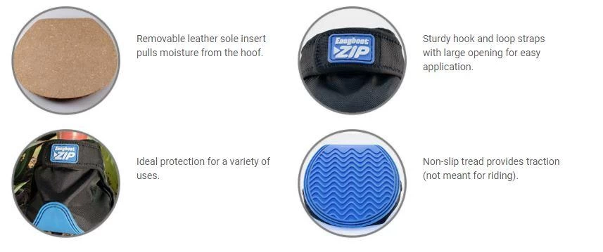 Easy to apply, the Easyboot Zip is a simple slip-on boot designed to protect the hoof. It’s a safer alternative to clumsy foot wraps used for medicating the hoof or keeping the hoof free from dirt and oils. The removable internal leather sole helps pull moisture from the hoof and can be easily removed for cleaning. Not for turn-out or riding.