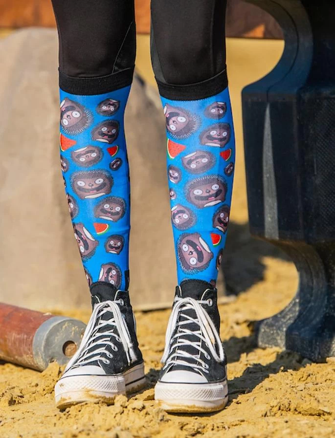 Our socks are super-soft to the touch with a thinly padded cotton terry footbed and our signature black bottom. We carried the padded footbed up the back of the socks to protect your heel from the bulk of your riding boot creases and spur strap placement. The cotton base wicks sweat, is breathable and long lasting. It is not too thick to change the shape of your boot, just enough to add some comfortable protection! The knit black cuff at the top of the sock prevents your amazing patterns from peeking out from under your boots! Not to mention that it helps you keep your socks up and in place!
