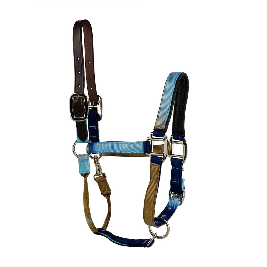 Nylon horse halter with various shades of blue and tan. Padded nose, round throat for comfort and adjustability. 1″ wide webbing, chrome plated hardware, unique stripe. Snap at throat. Round throat and brown leather crown.