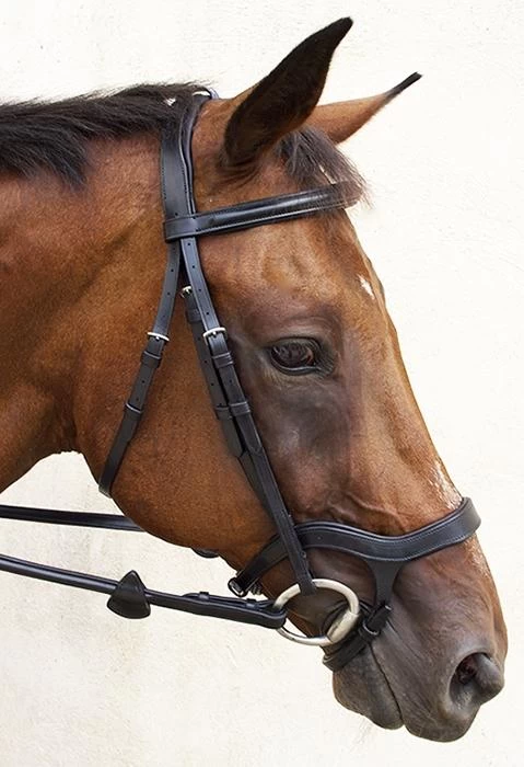 The new Nunn Finer Innovativo English Bridle has curved cavason cheeks that follow below the jaw line allowing for a more anatomically comfortable fit for you horse. Beautiful Italian leather, stainless fittings, and comes complete with rubber reins.