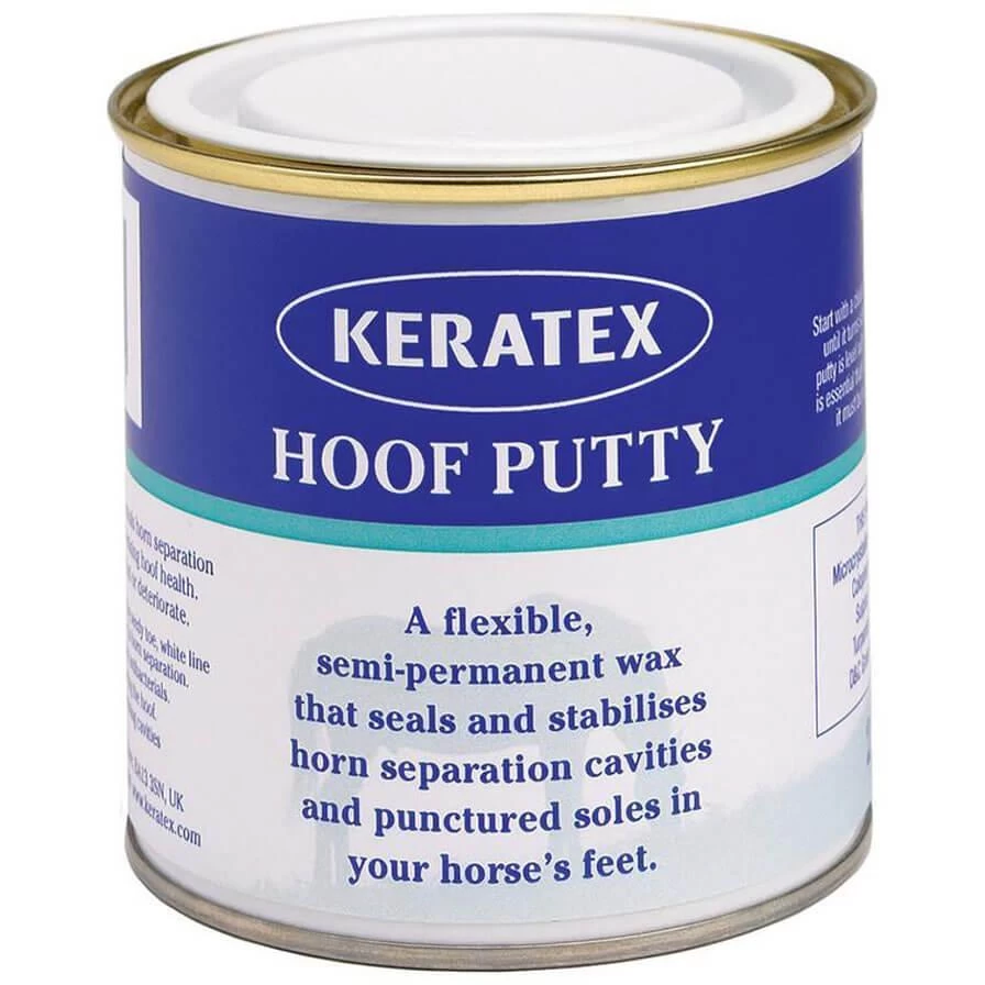 - To use, simply mould the adhesive putty in clean hands and press into the cavity until you have a dense plug for best results. Keratex Hoof Putty is a semi-permanent wax that seals and stabilises hoof separation, plus it prevents grit, mud and debris getting jammed up into the hole and damaging the recovery process. The adhesive filling mixture also disinfects making it the perfect aid to recovery after punctures, abscesses and cavities.