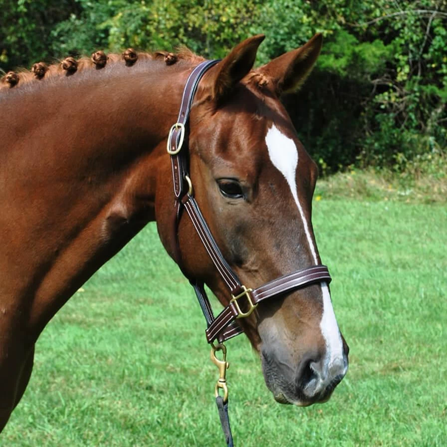 The Julie Halter is a Brown padded leather halter, similar to the Lainie Halter, but with a fixed noseband. Triple White stitching, and solid brass fittings