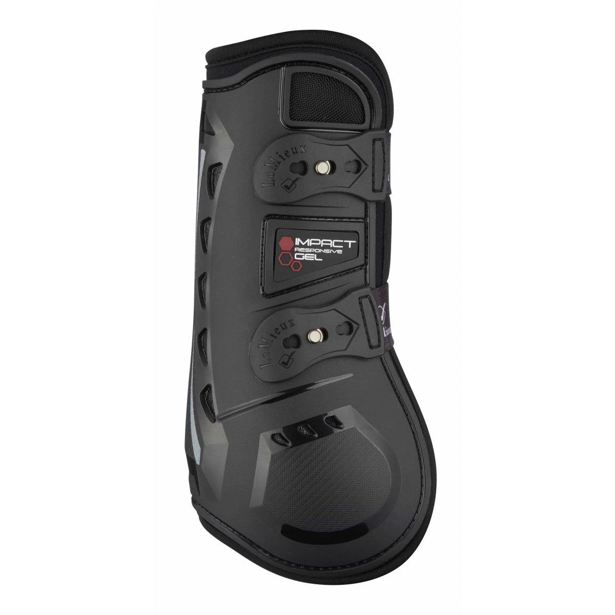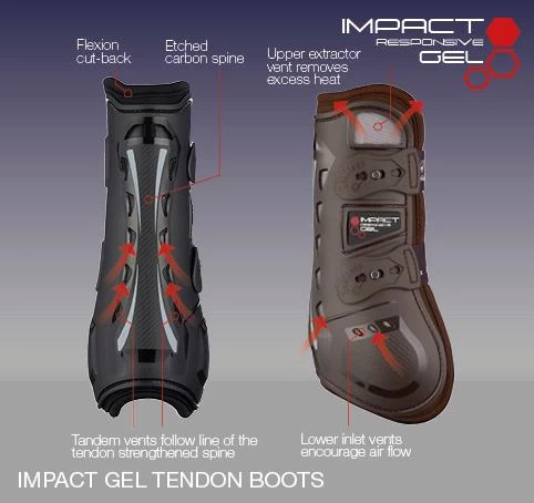 A range of jumping boots with enhanced vented protection. Lightweight, shock-resistant shell is anatomically molded to support the fetlock and tendon. Rear and side vents to release heat build-up. Air enters lower vents flowing around tendons and rises to the upper extractor vent. Integrated Impact Responsive Gel absorbs energy and concussion created whilst jumping and protects against strikes whilst landing and turning.