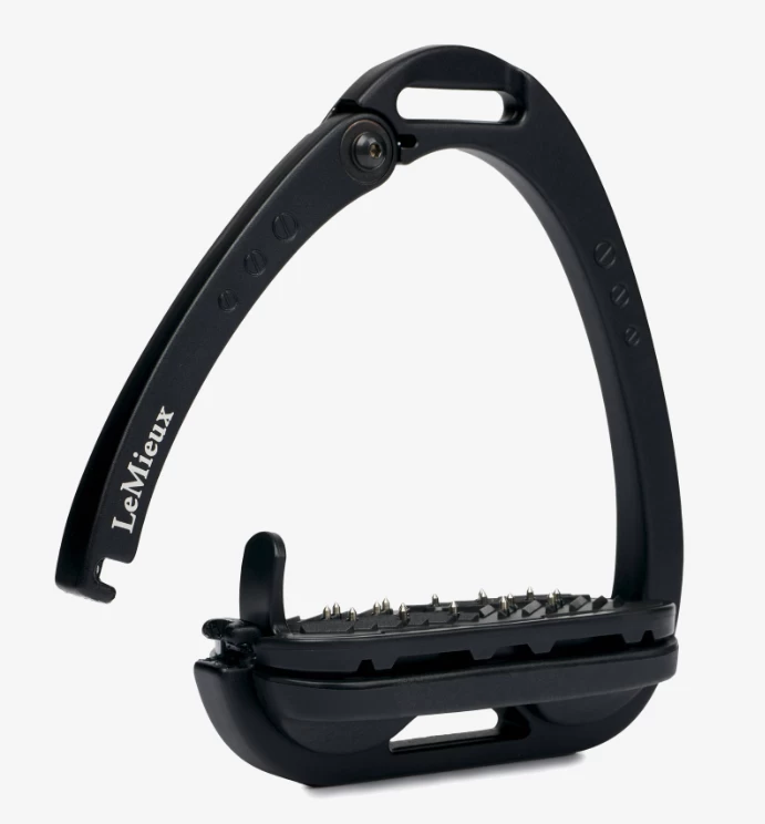 An integrated hinged arm has a two-stage release system, preventing unintentional opening. The spring-loaded arm locks into the base of the main frame meaning that when under maximum pressure, such as landing over a fence, the rider’s weight is spread evenly across the stirrup, preventing the outside from dropping and flexing. When pressure is put onto the arm of the stirrup, the arm releases allowing the foot to come out of the stirrup and preventing it from getting stuck. The stirrup arm breakout force = 36N (equivalent to 3.62kg) in testing meaning enough resistance to stop it from opening unintentionally but will release when needed.