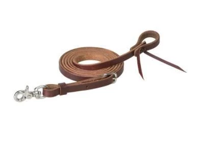 Extra heavy harness leather is dipped in oil, dressed with butter and hand rubbed for the ultimate in performance and a rich golden chestnut color. These roper reins feature weighted ends for a substantial feel, an adjustable design and a solid brass or stainless steel scissor snap. Measures 5/8″ x 8′.