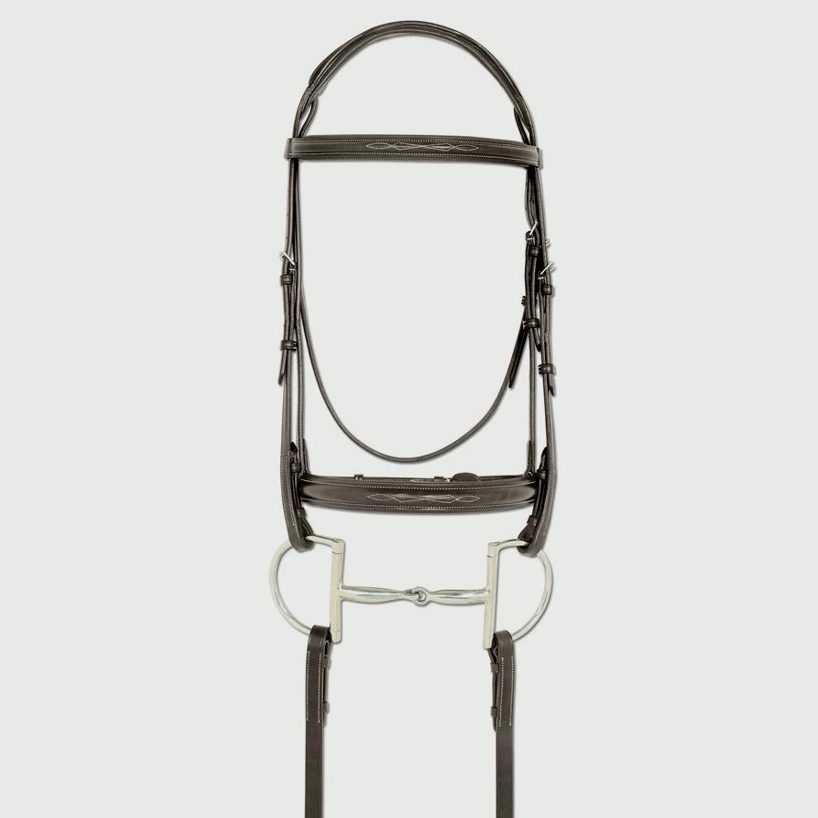 The Recessed Crown System is designed to alleviate unwanted pressure on the sensitive poll area of the horse. The RCS design allows the cavesson strap to pass over the crown in a recessed channel with only soft padding touching the horse. The RCS Wide Padded Nose Bridle is crafted in rich and supple Italian leather, and features fancy stitching on the wide-nose cavesson and browband, and fancy stitched raised laced reins.