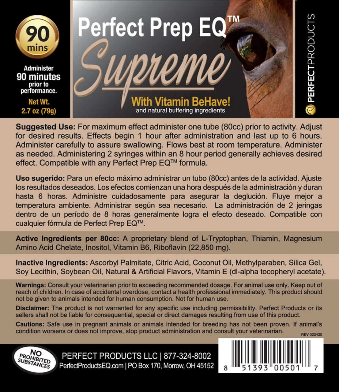 Similar to Extreme, Perfect Prep EQ Supreme is quick acting, targeted horse calming supplement formula with Vitamin BeHave that creates an even greater calming effect.