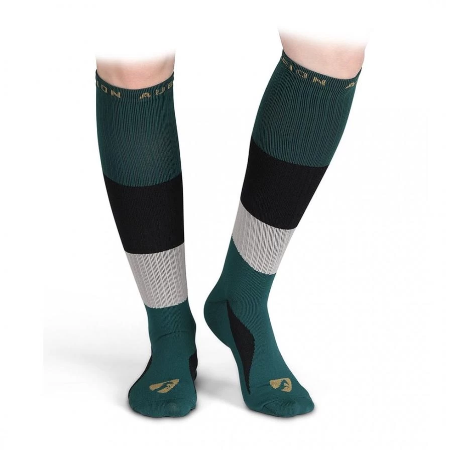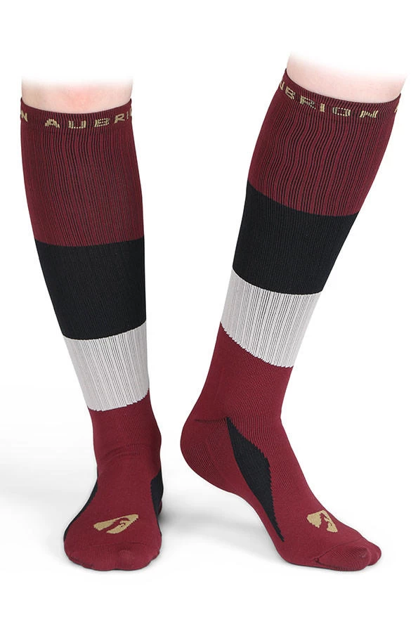 These sporty socks provide high elasticity compression around the legs to improve circulation and help prevent muscle vibration. Recovery after strenuous exercise is also aided by increased oxygen delivery to reduce lactic acid buildup. Cushioned foot and heel for optimum comfort.
