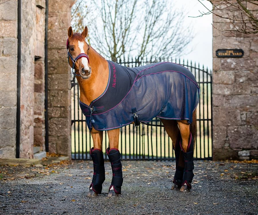 This dual effectiveness cooler provides you with the ultimate warm weather cooler preventing the horse from overheating on those hot days. The top section is made from a cotton rich fabric with super wicking ability. The contoured net sides allow free flow of air for very fast drying. Team it with Horseware’s Grand Prix accessories for a fabulous look at shows.