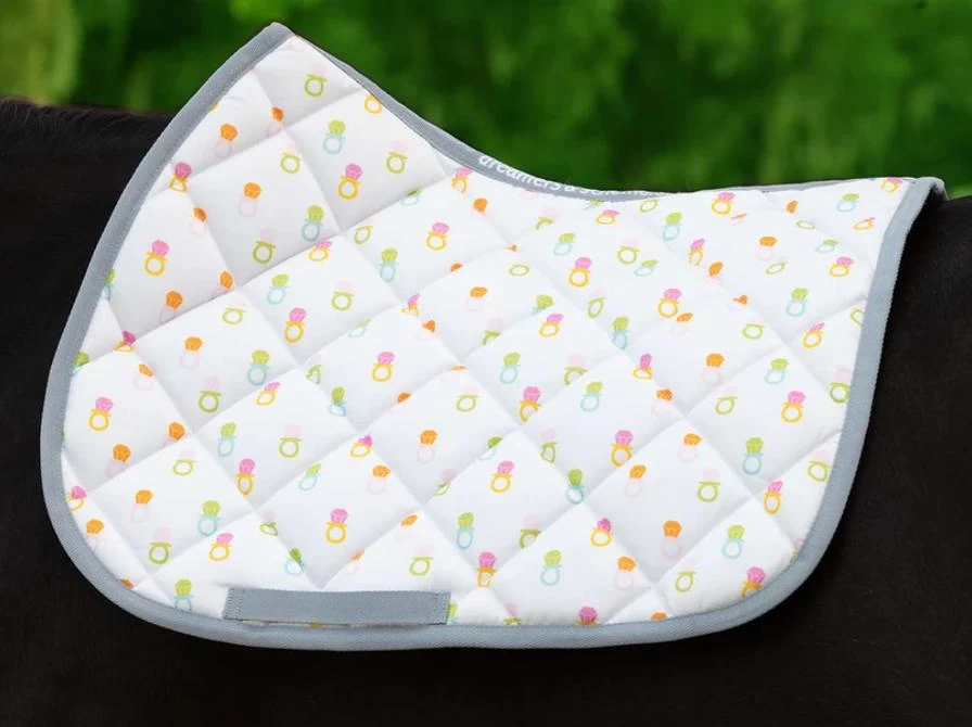 This squishy, cushioned saddle pad is contoured around the horse’s withers to help alleviate pressure while riding. Silly printed patterns on the outside, with a mesh underside to keep your horse cool during exercise.
