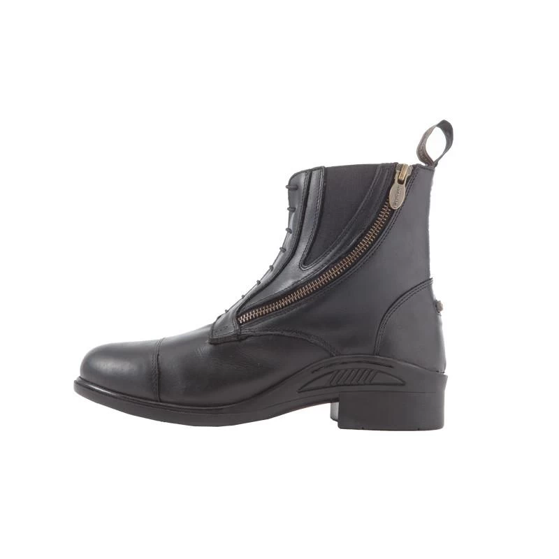 Made of particularly robust, naturally tanned, oiled cowhide leather, making it very durable and easy to care for. The specially developed last is extremely comfortable to wear. Lacing at the front, curved zipper at the side in an elegant brass look, zipper branded with cavalcade. Thanks to the elastic inserts on both sides, it lies particularly nicely on the ankle. Loop at the entrance for easy slipping. With spur holder. The high-quality insole ensures optimal pressure distribution in the footbed and is breathable at the same time for a comfortable fit. The robust non-slip rubber sole of the shoe is very flexible, enables anatomical rolling and is gentle on the joints.