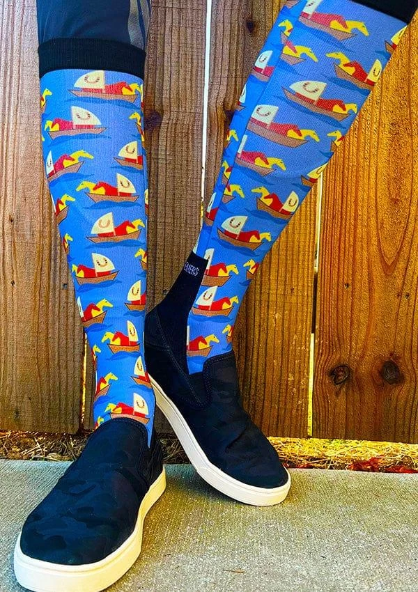 Our socks are super-soft to the touch with a thinly padded cotton terry footbed and our signature black bottom. We carried the padded footbed up the back of the socks to protect your heel from the bulk of your riding boot creases and spur strap placement. The cotton base wicks sweat, is breathable and long lasting. It is not too thick to change the shape of your boot, just enough to add some comfortable protection! The knit black cuff at the top of the sock prevents your amazing patterns from peeking out from under your boots! Not to mention that it helps you keep your socks up and in place!